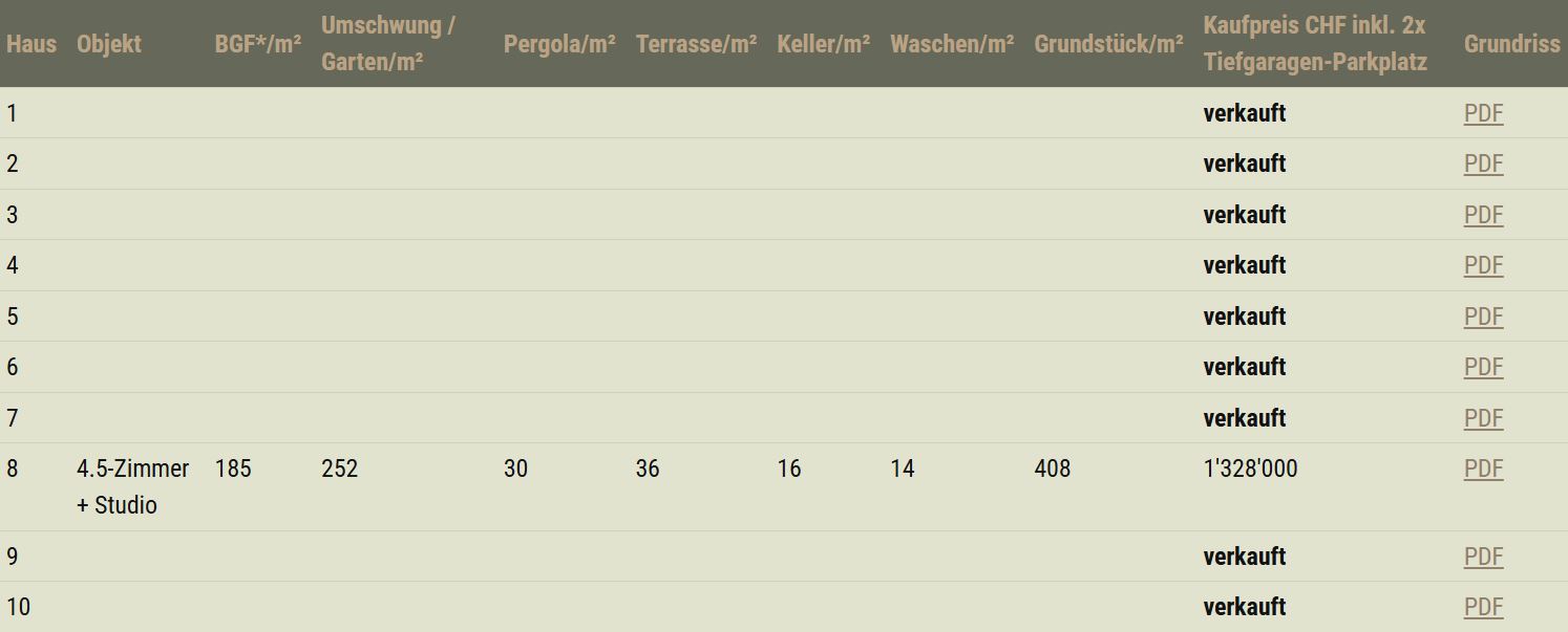 | Haus | Objekt | BGF*/m² | Umschwung / Garten/m² | Pergola/m² | Terrasse/m² | Keller/m² | Waschen/m² | Grundstück/m² | Kaufpreis CHF inkl. 2x Tiefgaragen-Parkplatz | Grundriss |
